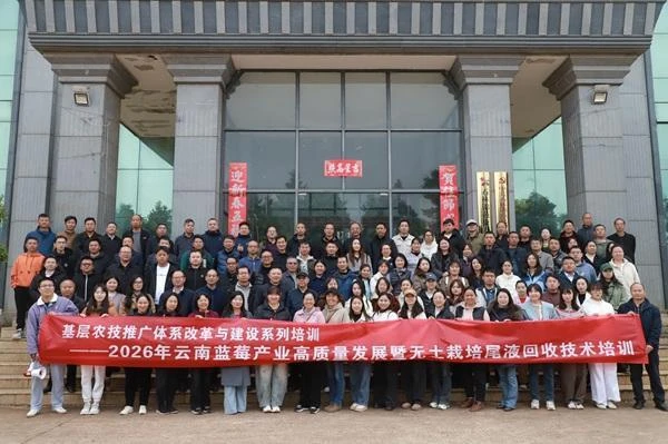 3月11日至13日,由云南省花卉技术培训推广中心、昆明市农业农村局联合主办的基层农技推广体系改革与建设系列培训——2026年云南蓝莓产业高质量发展暨无土栽培尾液回收技术培训(昆明场)成功举办,来自昆明石林、安宁、宜良等13个县(市、区)140余名基层农技人员、种植户代表参训。