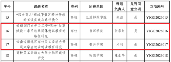 本次省教育厅关工委共立项高校课题50项,我校两项课题分别由张彩虹、邱羽老师牵头主持,聚焦边疆高校关工委工作特色与育人实际,既立足民族团结进步教育的时代要求,也回应大学生就业创业的现实需求,体现了学校关工委工作围绕中心、服务大局的定位。