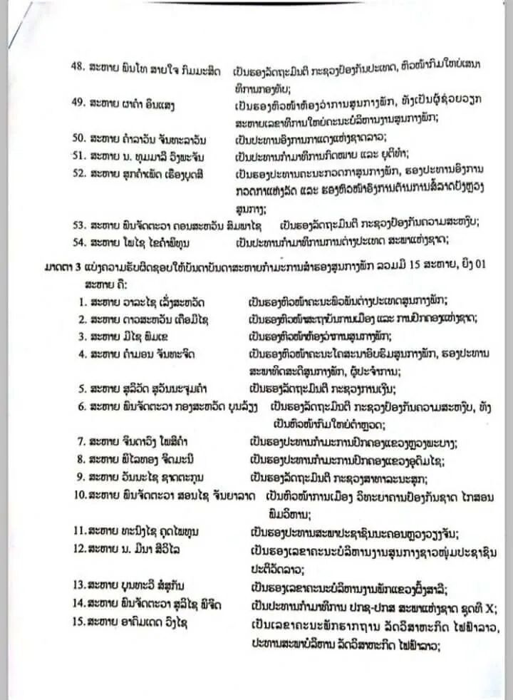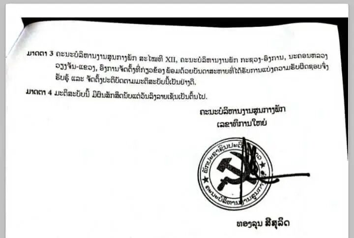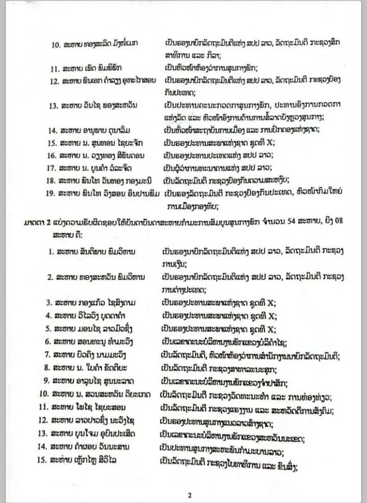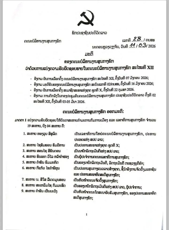 据老挝人民革命党中央委员会2026年3月11日发布的中央委员会28号决议,老挝党中央委员会根据第十二届全国代表大会、第十二届一中全会及第十届国会选举结果,经第十二届中央委员会第二次全体会议(3月3日至5日)审议决定,正式公布了第十二届中央领导机构的分工名单。此次分工涉及政治局委员、中央书记处书记、中央委员及中央候补委员,明确了新一届党和国家领导人的具体职责。