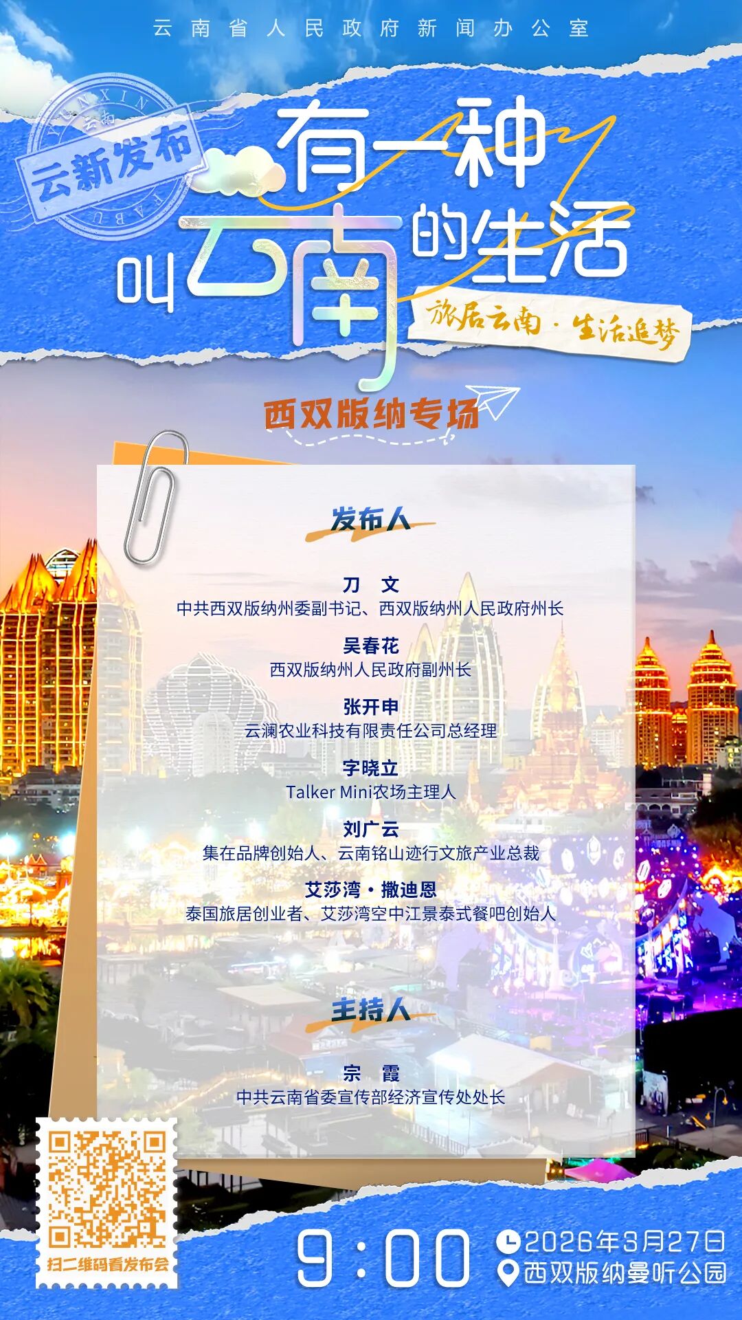 3月27日上午,云南省人民政府新闻办公室在西双版纳曼听公园,举行“有一种叫云南的生活·旅居云南 生活追梦”系列新闻发布会·西双版纳专场,邀请相关行业领域旅创代表分享从“游”到“居”、由“居”而“创”的追梦故事并回答记者提问。