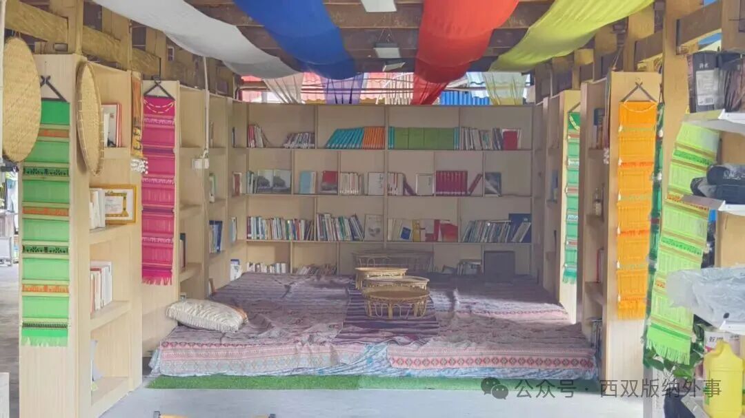 国门书社位于勐腊县勐满镇曼烈村民小组原党支部书记岩书家,他无偿将自家1楼的生活空间腾出来,就着木楼的柱子,立起书架,陈列书籍。并依照中老边民喜欢坐竹席的生活习惯,搭建地台,摆好竹编桌子、傣族特色垫子,用彩色纸伞、傣族织锦等装饰,小小的空间温馨而别具特色。