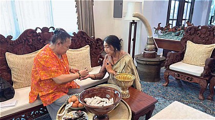 4月10日上午10:00时,王爱民(小双)一行怀着崇敬的心情,来到现任总理母亲80多岁高龄的老咪涛家中。当房门打开,轮椅上的老咪涛一眼便认出小双,激动的竟扶着轮椅站起,眼中满是久别重逢的欣喜。小双快步迎上前,紧紧拥抱这位如同母亲般的长辈,千言万语都化作这一温暖的相拥。落座后,和蔼可亲的老咪涛和小双聊起家常,笑容始终挂在老人的脸上,如同母亲盼着远行的女儿归家一般,满心都是牵挂与惦念。为了给小双及随行人员消灾祈福,老咪涛亲自为大家栓线念经,把祝福系在每个人的手腕上;还特意拿出精心准备的老挝花裙布料,送给小双,叮嘱她做一条漂亮的裙子。阳光透过窗洒进客厅,百合的清香也萦绕鼻尖,这一刻,没有身份的隔阂,只有亲人般的温暖与牵挂,生动普写中老两国人民血浓于水的深厚情谊。