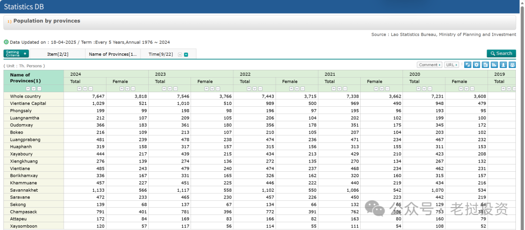 2019年-2024年老挝全国及各省(首都)人口数据表