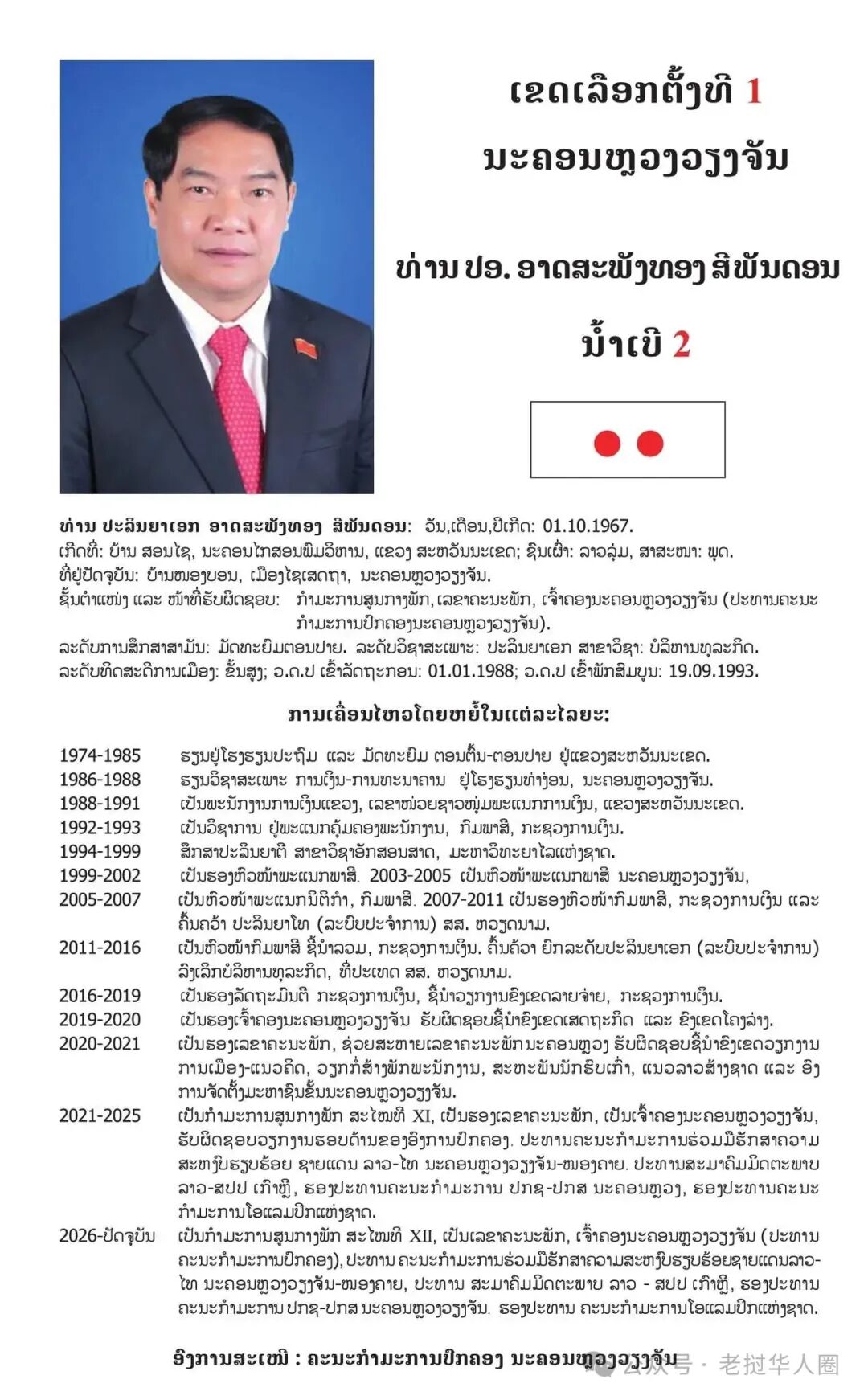 现任职务及负责工作: 党中央委员、万象市委书记、万象市市长(万象市行政管理委员会主席)。