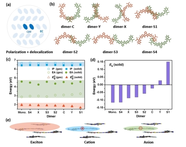 在前期工作中,研究人员对系列非富勒烯体系计算发现,激子分离的驱动力与激子束缚能线性相关,为降低驱动力减小能量损失指明了方向(J. Phys. Chem. C 2018, 122, 22309)。进一步发展了自洽的量子力学/嵌入电荷方法(QM/EC)计算电子极化效应,实现从第一性原理水平上可靠评估静电作用和诱导效应,且能够考虑分子堆积结构的影响。计算发现非富勒烯受体的激子束缚能与单晶中分子堆积结构密切相关,最小值只有40 meV,打破了有机材料激子束缚能在0.3 eV以上的传统认识(J. Phys. Chem. Lett. 2019, 10, 4888)。此外,对具有不同晶相的有机光伏小分子受体研究证明,仅分子排列方式的差异可以大幅改变激子束缚能(J. Phys. Chem. Lett. 2020, 11, 10227)。