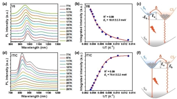 图2.Y6和ITIC薄膜的变温光致发光光谱以及电荷分离与复合过程示意图
