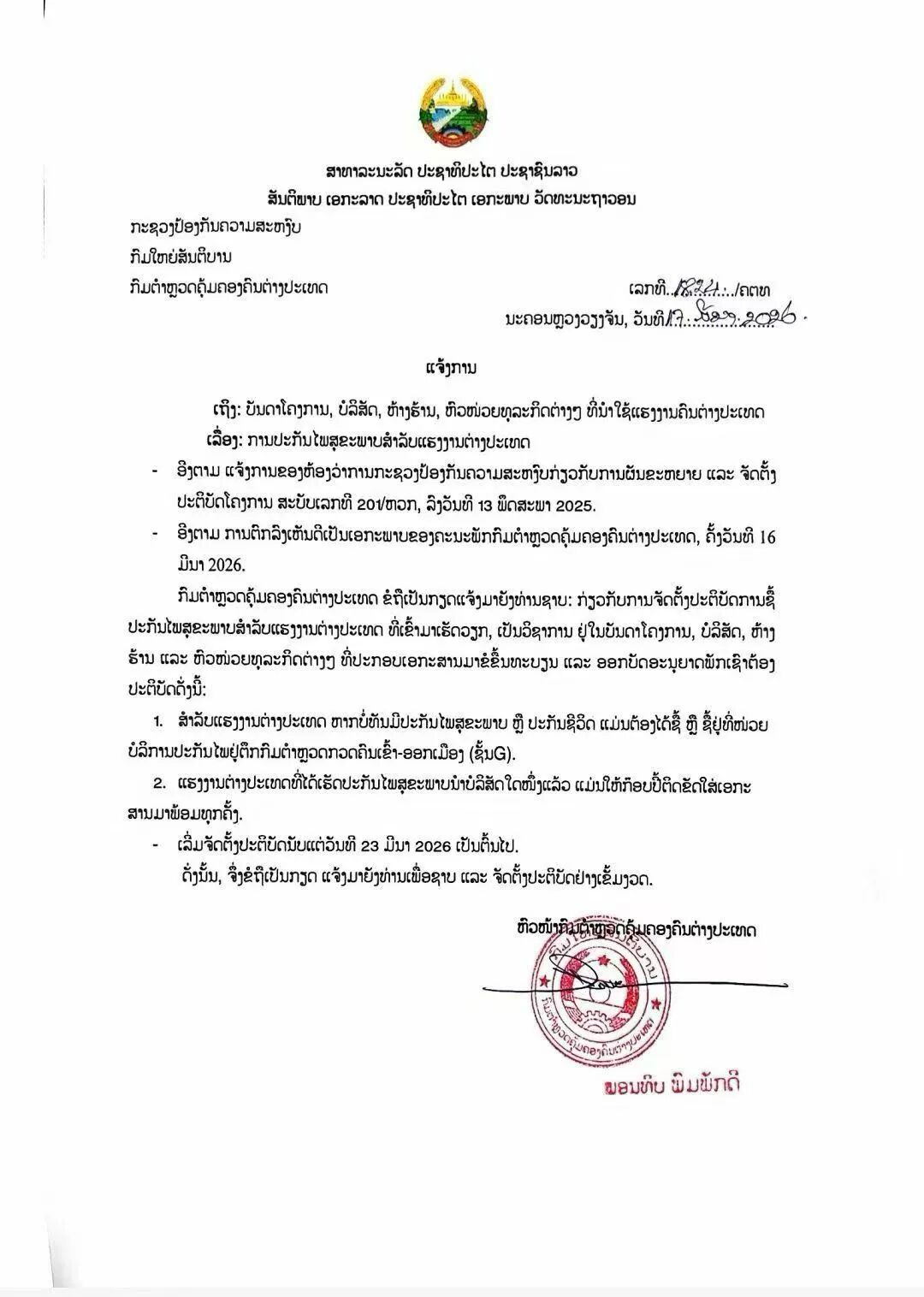 为进一步规范外籍人员在老挝的居留管理,保障外籍劳工的健康安全与合法权益,老挝公安部外国人管理警察司于3月17日正式签发第1834/???号通知,明确规定所有在老挝工作的外籍人员必须拥有健康保险。新规自2026年3月23日起正式实施,适用于所有雇用外国工人的工程项目、公司、商店及其他商业实体。