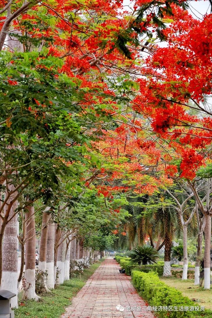 走在特区的每条街道,这一簇簇火红,却是很抢眼啊!看吧,最耀眼的是,那一片片青绿色凤凰树叶衬托着一簇簇火红色的凤凰花,在阳光的照耀下,满树如火,如云似锦。每条街道都掩映在凤凰花木之下,郁郁葱葱,蓝天绿叶红花,美不胜收,鲜艳的花朵吸引了众多居民、游客驻足观赏,纷纷点赞:这里才是最美的风景。