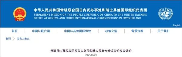 中国常驻日内瓦代表团网站6月21日消息,常驻日内瓦代表团发言人刘玉印就人权高专错误言论发表评论,对此坚决反对。