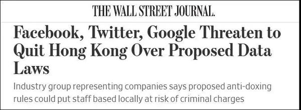 文章导读《华尔街日报》近日爆料称,因为香港特别行政区政府打算修订“个人资料条例”,打击“人肉搜索”(香港称“起底”)行为,包括脸书、推特和谷歌在内的互联网诸巨头,居然以“可能停止在港提供服务”相要挟,私下“警告”特区政府。……