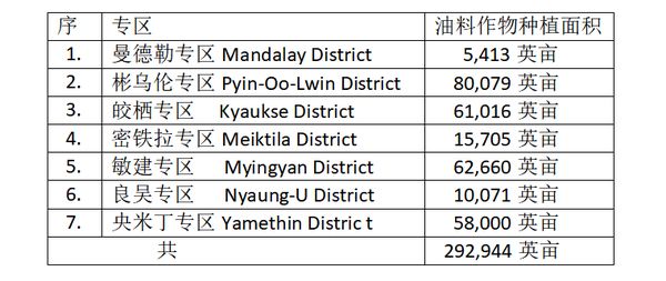 今年冬季各专区规划种植的油料作物面积分别为:曼德勒专区5,413英亩,彬乌伦专区80,079英亩,皎栖专区61,016英亩,密铁拉专区15,705英亩,敏建专区62,660英亩,良吴专区10,071英亩,央米丁专区58,000英亩,全省共29多万英亩。