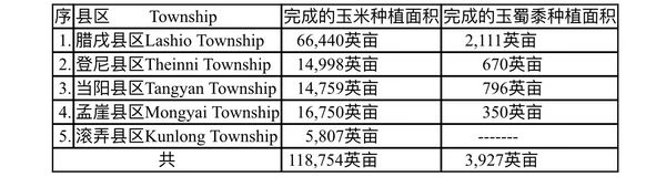 腊戌专区内的各县区目前所完成的玉米及玉蜀黍种植面积如下表: