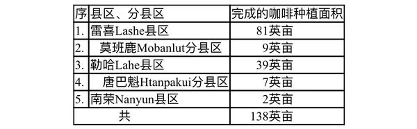 目前那加民族自治区内的各县区、分县区内所种植的咖啡面积如下表: