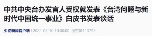 国务院台湾事务办公室、国务院新闻办公室10日联合发表《台湾问题与新时代中国统一事业》白皮书,进一步重申台湾是中国的一部分的事实和现状,展现中国共产党和中国人民追求祖国统一的坚定意志和坚强决心,阐述中国共产党和中国政府在新时代推进实现祖国统一的立场和政策。