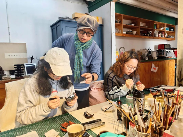 旅居大理中和村的手工艺人指导学员学习金缮修复工艺。图源:云南日报