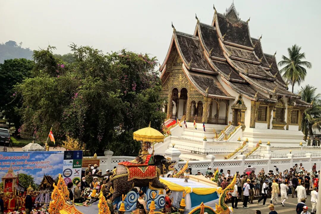 当地近两千名表演者身着传统服饰跟随不同主题的花车登场,生动展现琅勃拉邦独特民俗风情和深厚历史底蕴。以野猪为造型的压轴花车载着刚刚选出的2026老挝“宋干女神”缓缓行进,沿途欢声一片,节日氛围热烈喜庆。