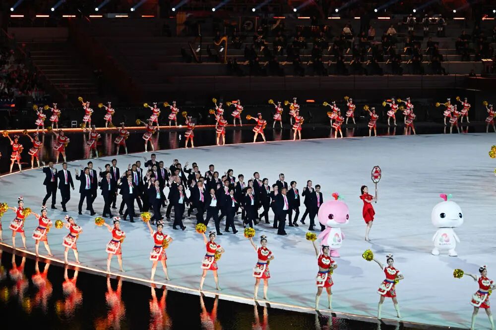 广东省体育代表团、香港特别行政区体育代表团、澳门特别行政区体育代表团在入场仪式上共同入场。黄伟 摄