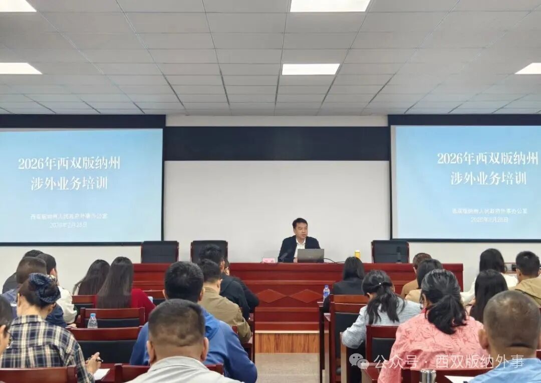 2月28日,州外办在州委党校举办2026年西双版纳州涉外业务培训班,副主任刀琦作开班动员讲话。培训围绕因公出国(境)业务申办流程及材料要求、国际友好交流点报批工作流程、涉外礼宾礼仪与外事接待等工作进行系统讲解。全州各级各部门共100余人参加培训。