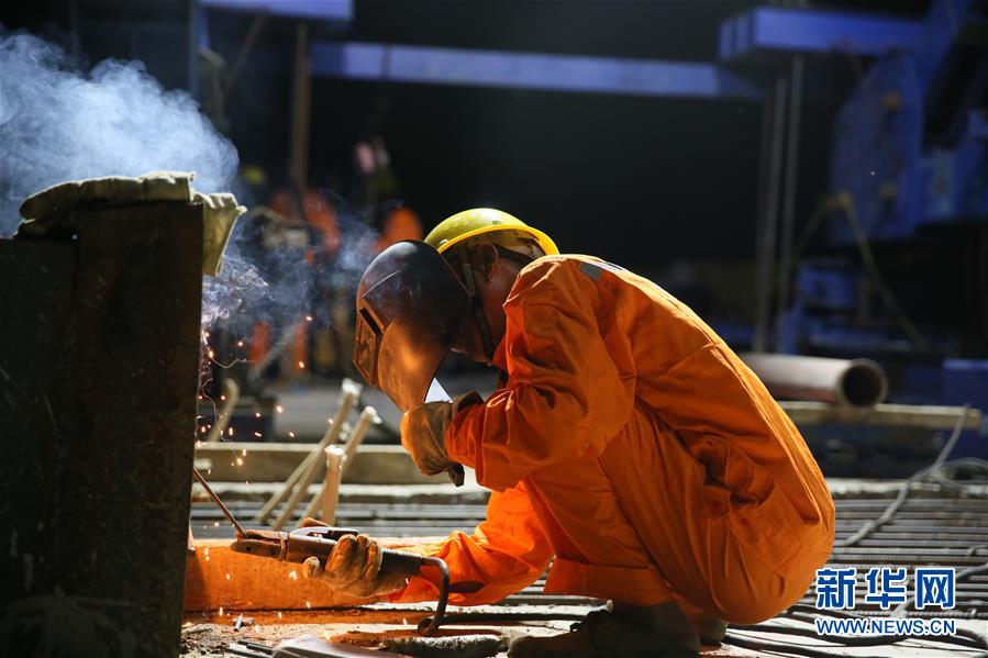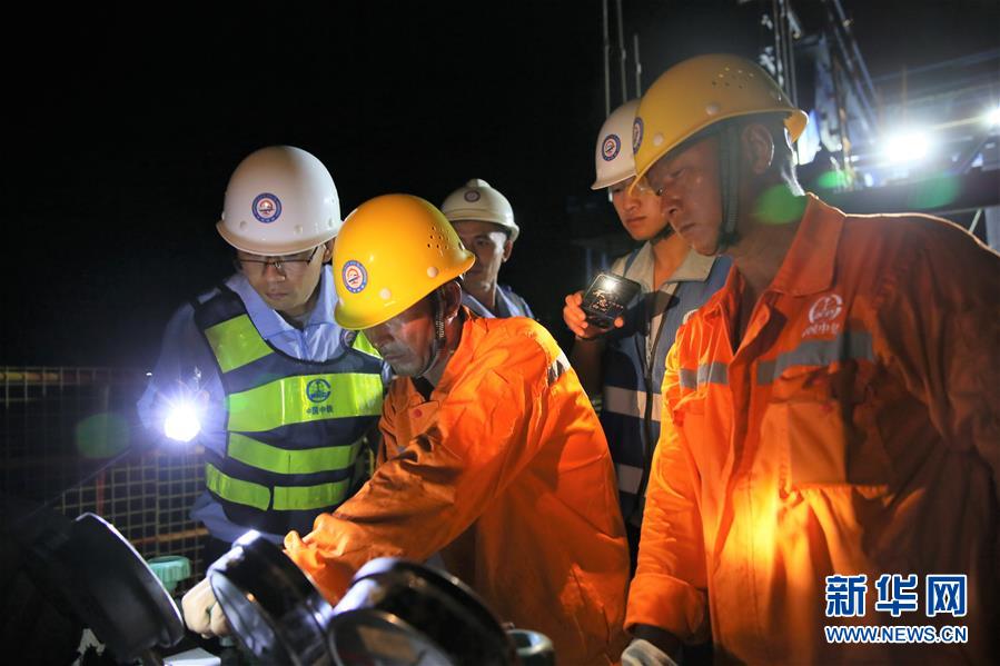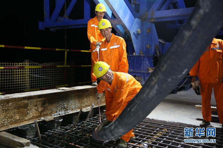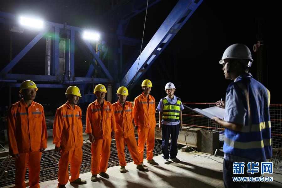 7月28日零点,中国中铁八局工人在中老铁路老挝琅勃拉邦湄公河特大桥上接受大桥合龙工作的任务。 随着最后一个合龙节段混凝土的浇筑,中老铁路老挝琅勃拉邦湄公河特大桥28日成功合龙,实现全桥贯通,比计划工期提前7个月。 新华社发(熊天泽摄)