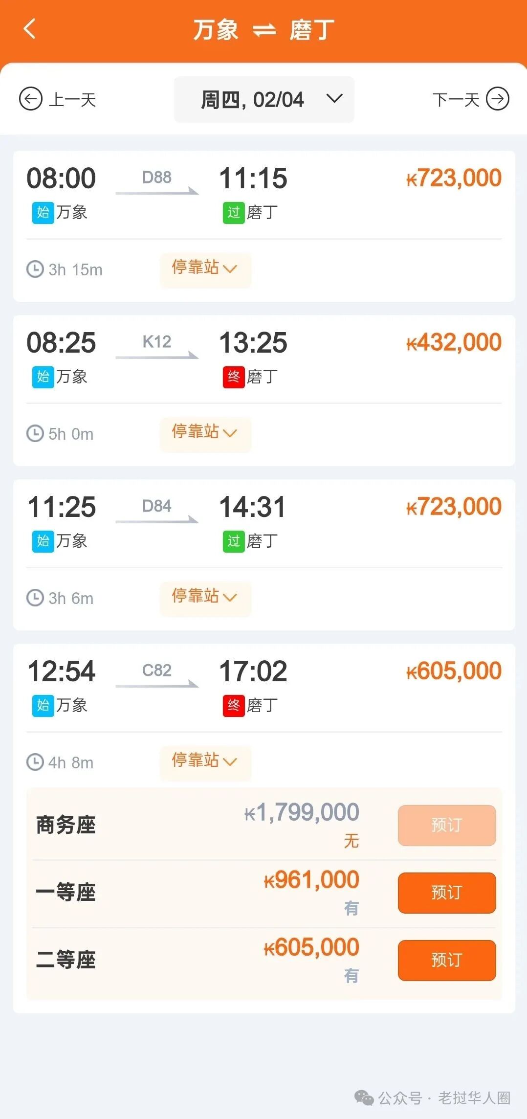 万象至琅勃拉邦高速列车票价对比表