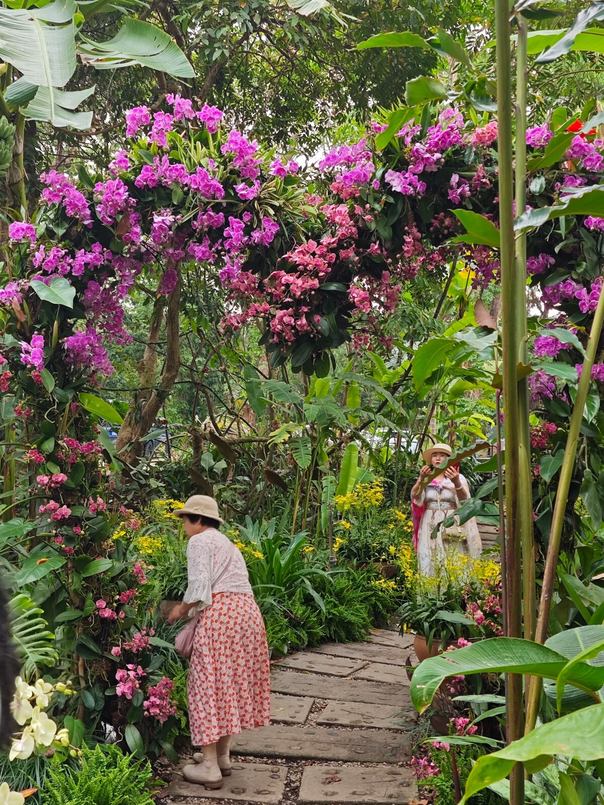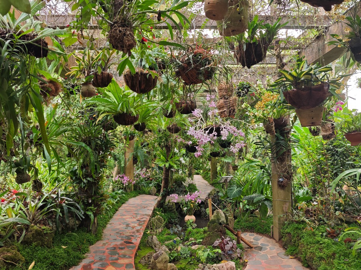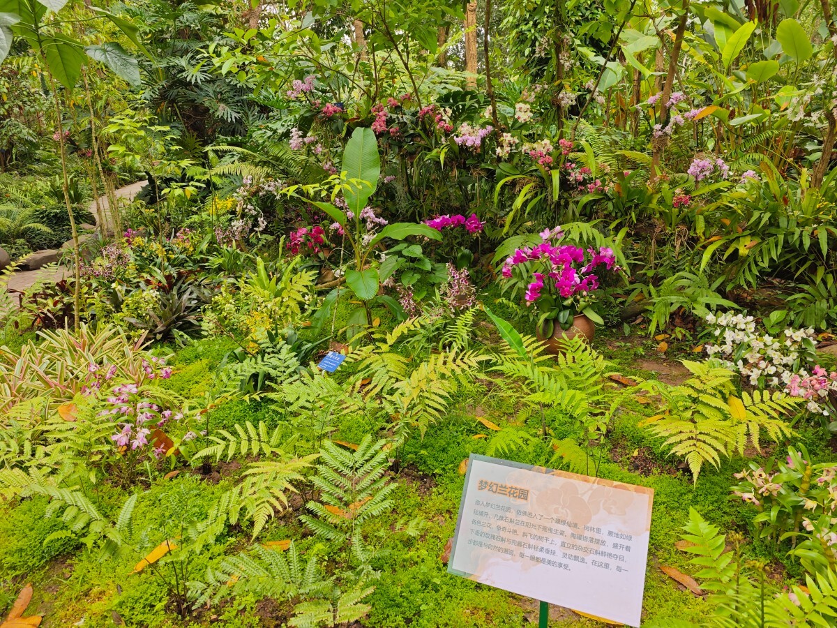 梦幻兰花园:?踏入梦幻兰花园,仿佛进入了一个翠绿仙境。树林里,蕨地如绿毯铺开,几株石斛兰在阳光下摇曳生姿。陶罐错落摆放,盛开着各色兰花,争奇斗艳。斜飞的树干上,直立的杂交石斛鲜艳夺目,下垂的玫瑰石斛与兜唇石斛轻柔垂挂,灵动飘逸。在这里,每一步都是与自然的邂逅,每一眼都是美的享受。