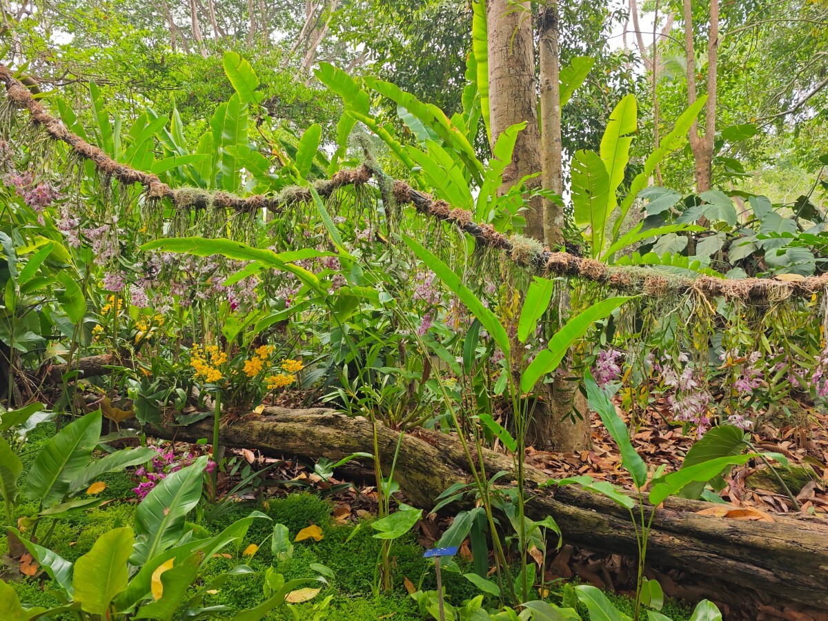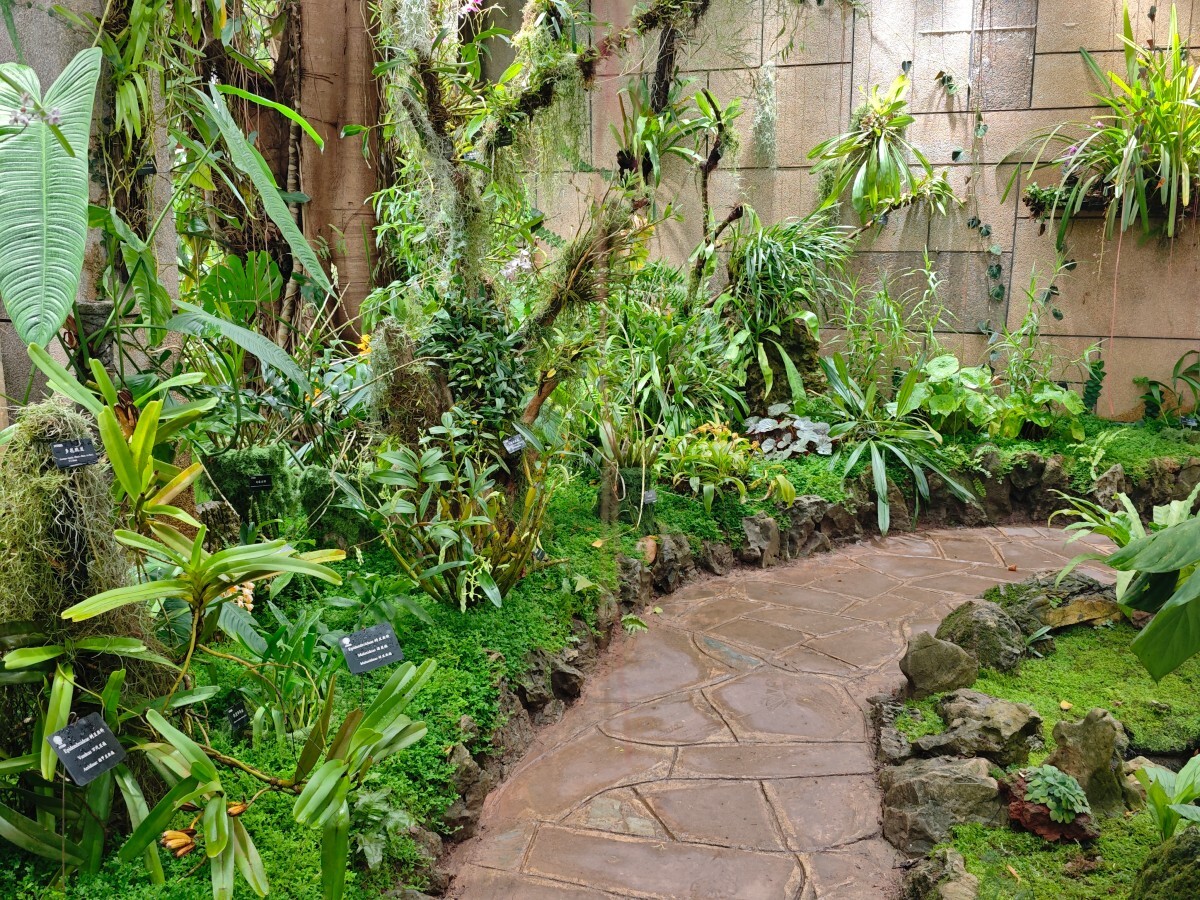 热带兰花掠影:步入这兰香氤氲的秘境,蜿蜒的廊道在葱茏绿意中穿行,仿佛走进了热带兰的幽谷。热带兰花色绚烂、姿态奇绝,兼具极高的观赏与育种价值。这片区域共收集了约60种热带兰,既有金钗石斛、鸟舌兰、大香荚兰、带叶兜兰、腋唇兰等原生珍品,也不乏石斛属、万代兰属、文心兰属的优良杂交品种。再搭配上天南星、凤梨、蕨类、球兰、秋海棠等植物,共同营造出一方野趣盎然的热带兰生境。