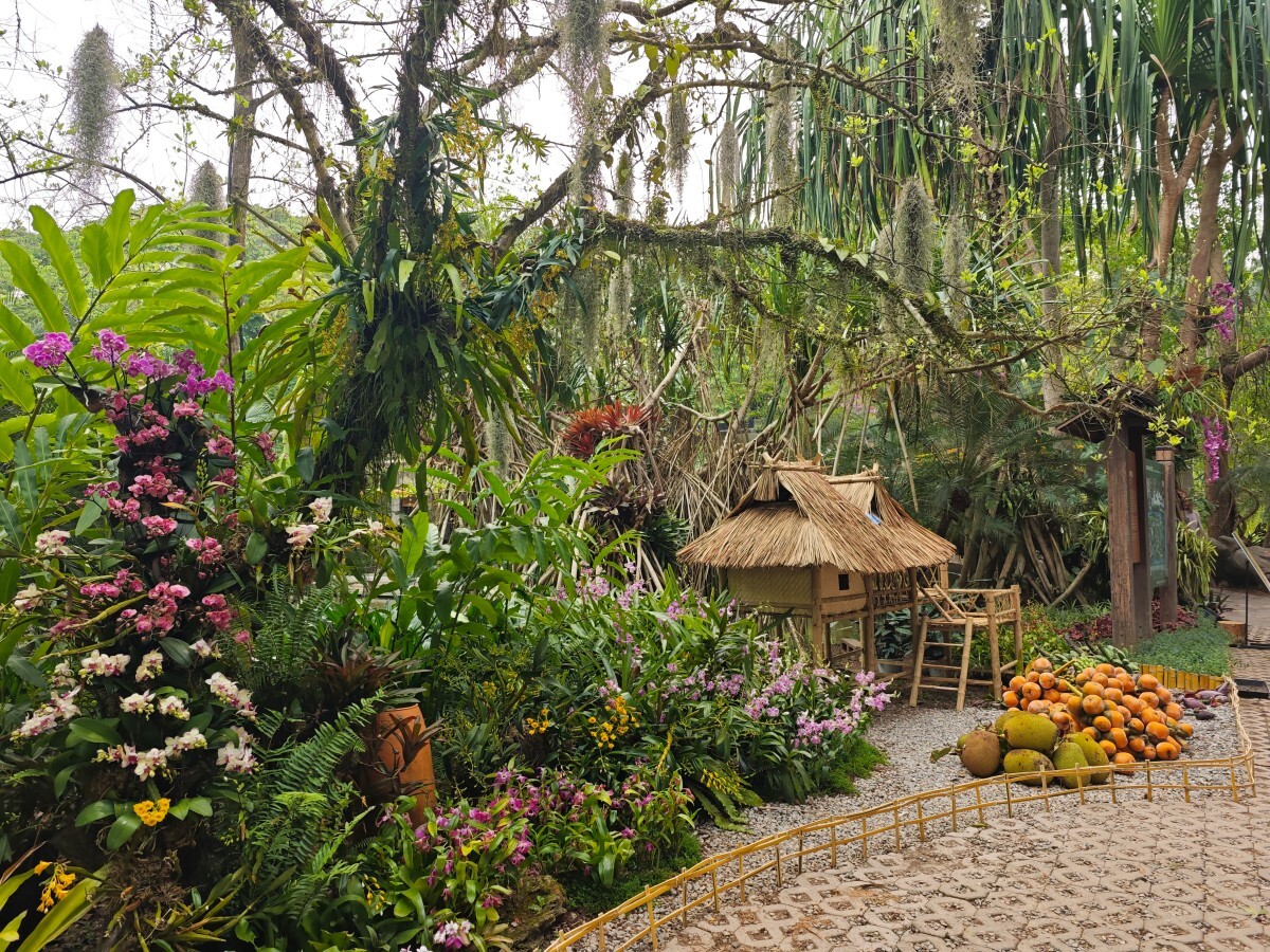 空中花园:以乔木为骨架、附生兰花为点缀、藤蔓植物为纽带,构建了“地面—树干—空中”三维立体空间结构,交织成流动的空中花海。热带兰花、鹿角蕨等附生植物自由攀附,还原雨林生态原貌,四季色彩更迭,生机盎然。竹木茅草屋散落绿海,取在地之材、承传统之工,民族智慧与现代空间隔空对话,一屋一景皆成诗。