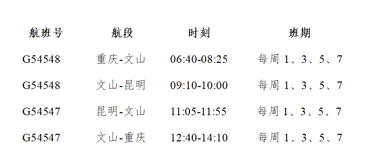 4月17日起,重庆?文山?昆明航线恢复通航,4月17日、4月20日已开行特别班次,5月起该航线将进入常态化运行阶段,每周执行4班,班期为周一、三、五、日。
