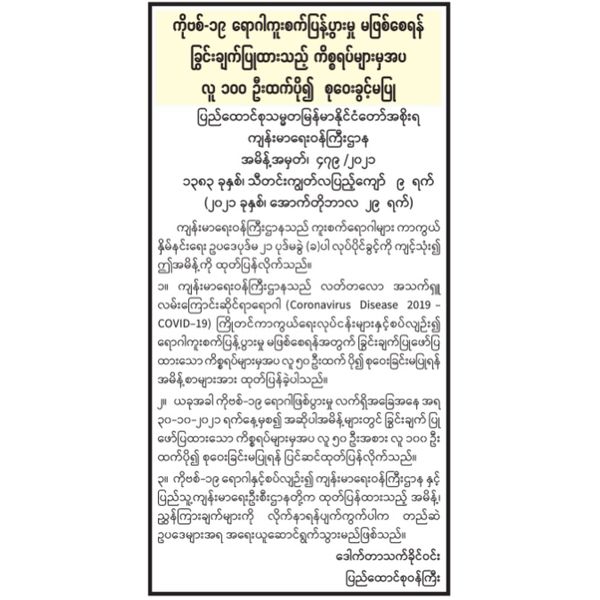 据10月30日出版的《缅甸之光》报报导,缅甸卫生部于2021年10月29日发出第479/2021号通令,禁止百人以上的集会活动。