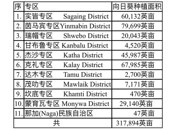 按:最近一个时期以来,缅甸农业生产部门大抓油料作物生产,希望能尽快改变缅甸国内食用油生产不足,不得不从国外进口大量的食用油这一现象。实皆省作为上缅甸的一农业大省,自然对油料作物的种植也必须付出一份力量。缅甸国内传统的油料作物主要是花生与芝麻,现在将向日葵也列入这油料作物行列之中,期望这些油料作物的大规模种植,能够改变缅甸国内食用油欠缺的处境。