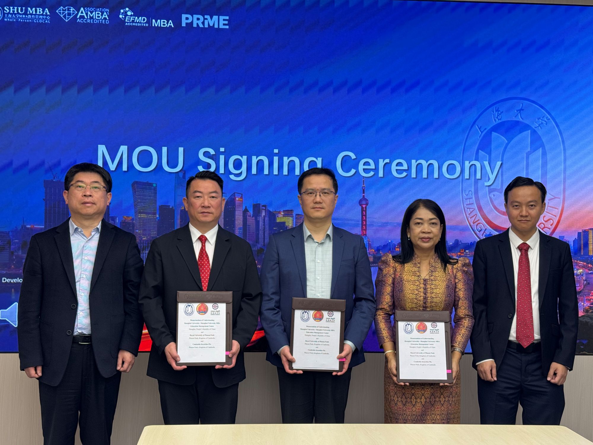 2026年3月30日,柬埔寨证券公司作为联合执行方,正式参与并推动上海大学、金边皇家大学与柬埔寨证券公司三方合作备忘录(MOU)签署,携手推动首个由中柬合作落地柬埔寨的 MBA 与 EMBA 高端管理教育项目。此项合作不仅标志着中柬教育合作迈入新的里程碑,也展现柬埔寨证券持续推进“以教育链接资本、以人才驱动发展”战略布局的重要成果。