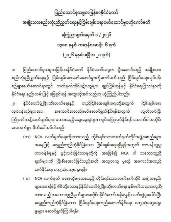 对于已签署NCA的组织,为获得持久稳固的和平,将邀请其会面讨论,共同全面履行NCA协议中的各项约定;对于尚未签署NCA的组织,则邀请其进行会面协商,以便根据双方达成的共识,与政府携手合作,为国家及本地区的发展建设持久稳固的和平。